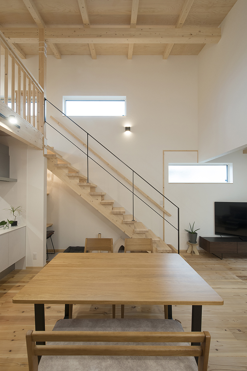 そして、リビングだけを勾配天井にして、ダイニングやキッチンは平天井にすれば、空間にメリハリが生まれます。勾配天井は見た目の美しさだけでなく、自然光を活かした心地よい空間づくりにもつながります。