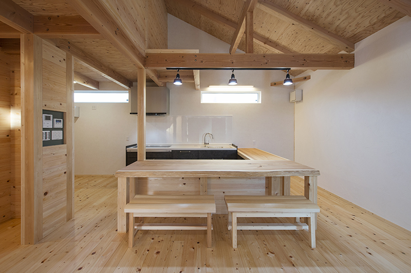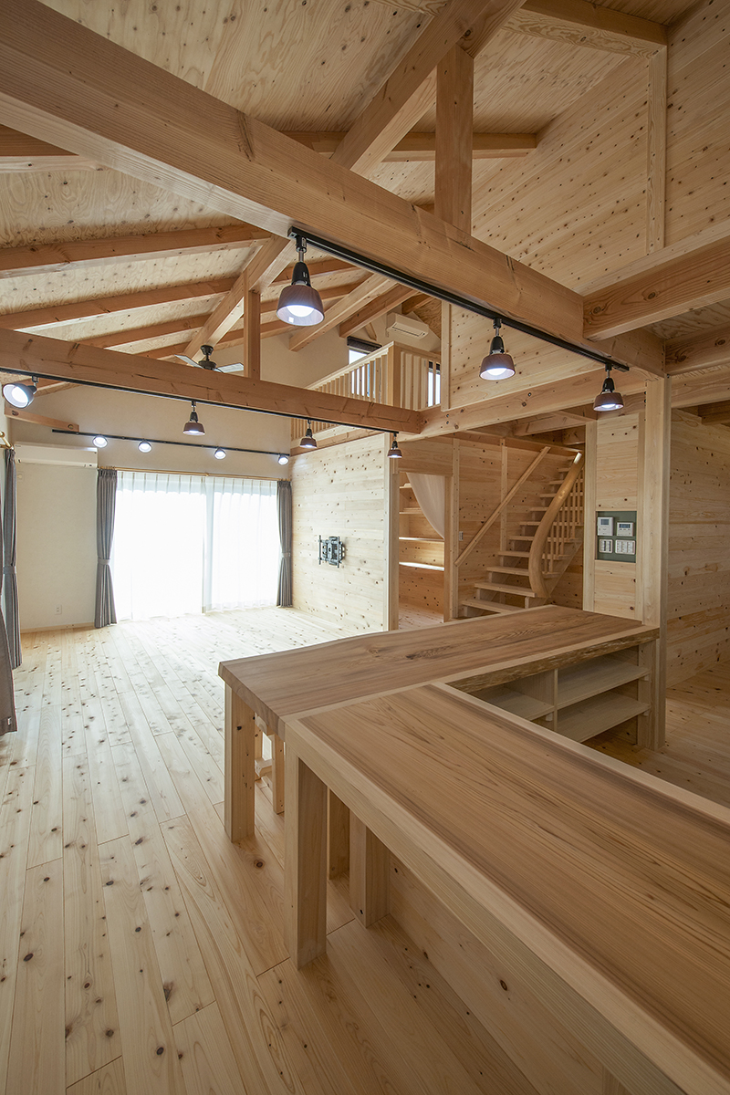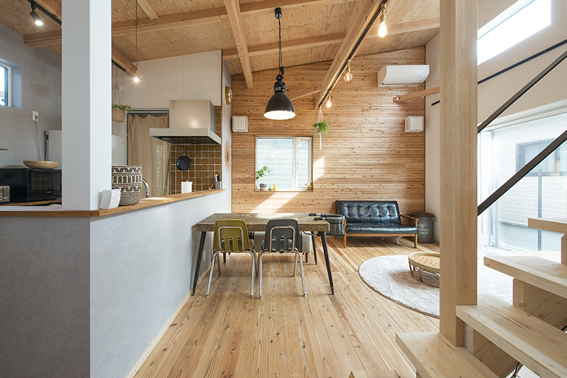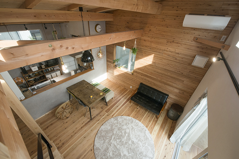 勾配天井では、構造上必要な梁(はり)をデザインの一部として活かすことで、おしゃれな空間がつくれます。