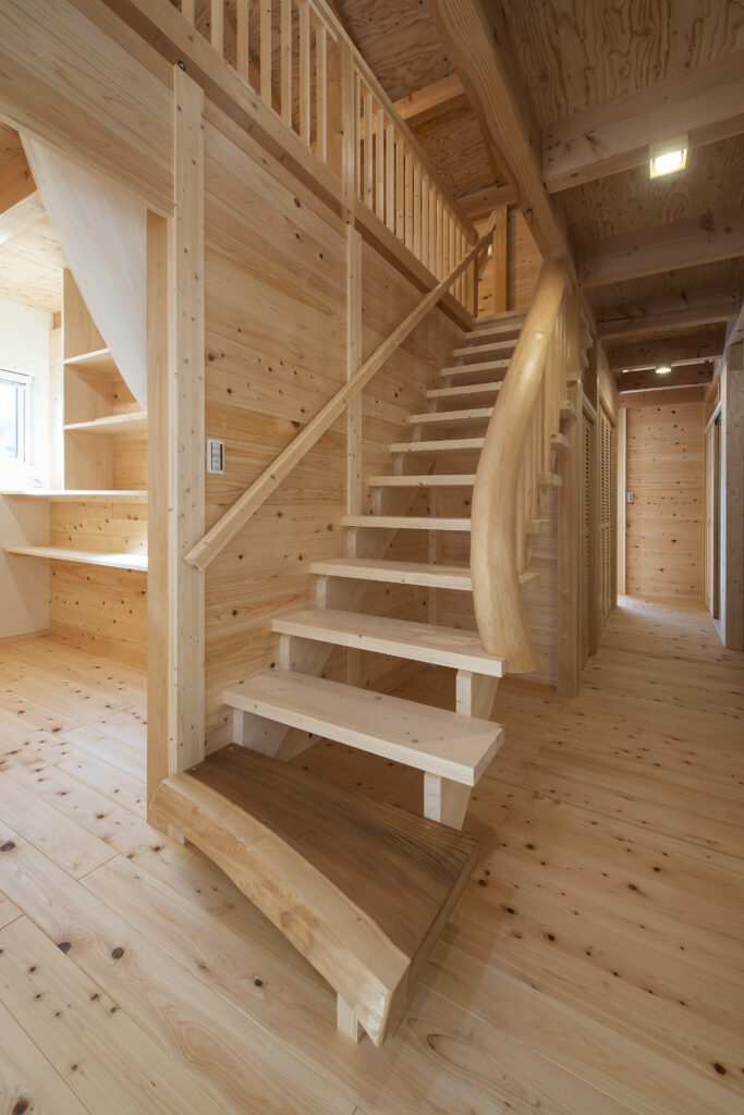 階段の手すりには変木を用い、木の表情を楽しめる、住まいのアクセントとしています。